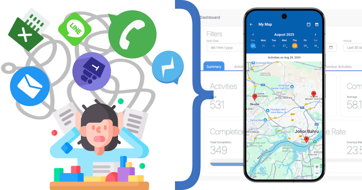 You have no idea where your field team is or what they're doing right now. Is Alex at the key client meeting in KLCC? Is Sarah stuck in traffic on the way to a delivery in Johor? You're completely in the dark until they decide to message you.